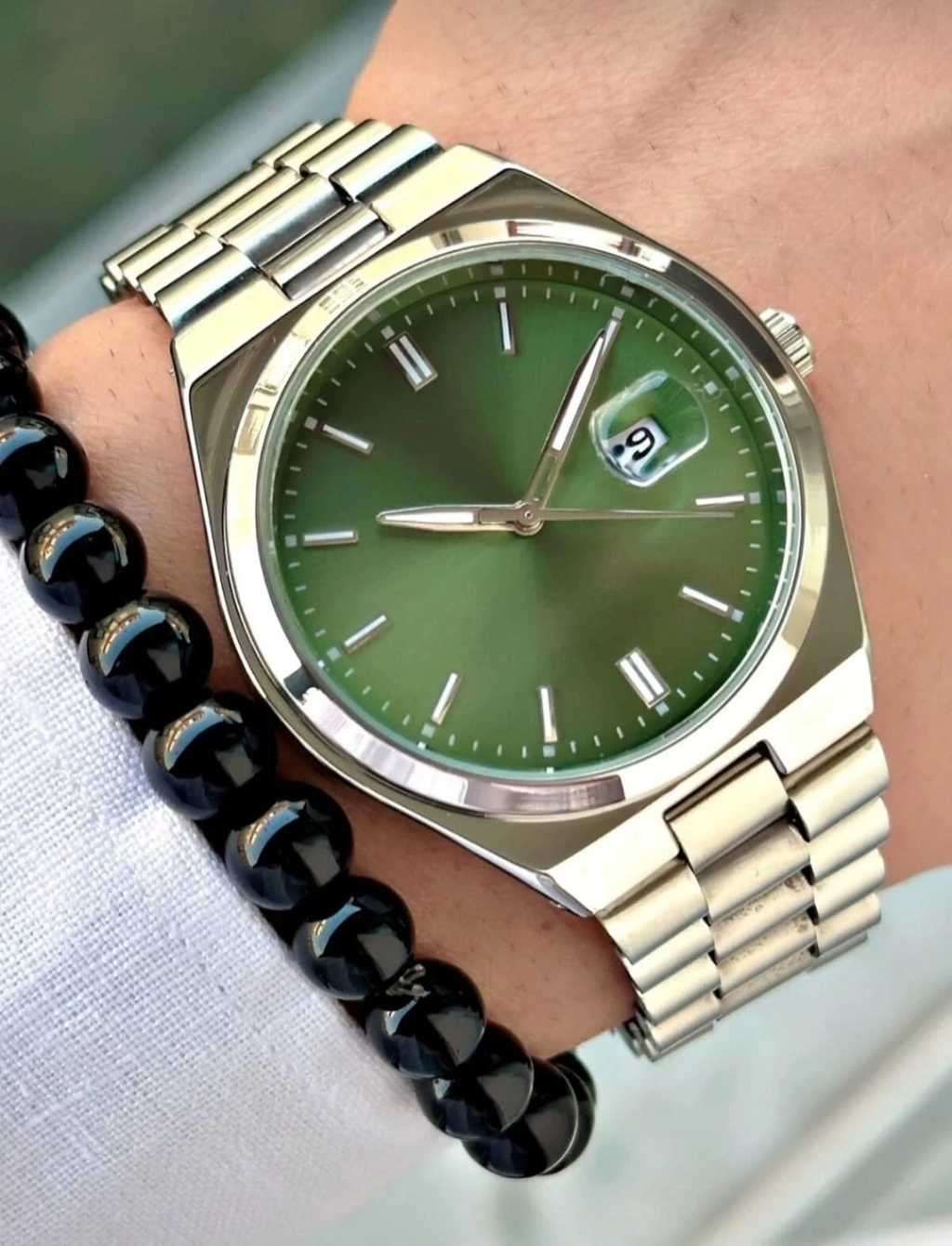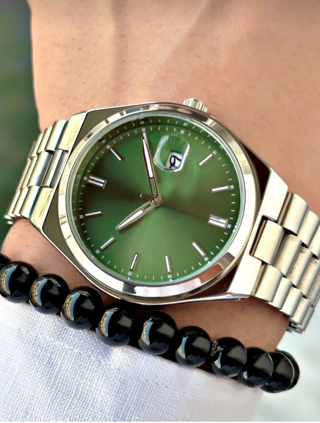 • ANALOG QUARTZ MAKİNA GÜMÜŞ ÇELİK KORDON YEŞİL KADRAN ERKEK KOL SAATİ