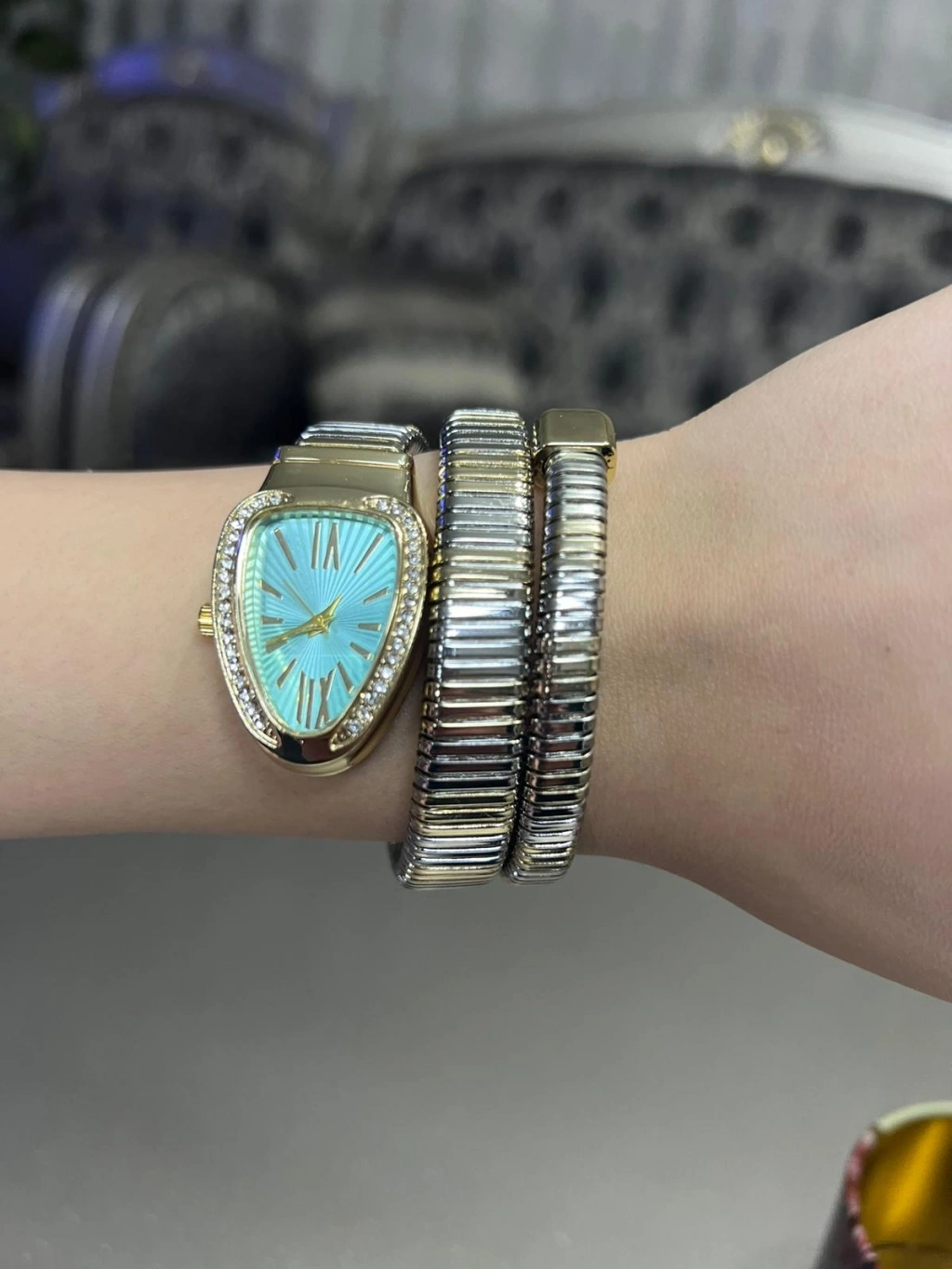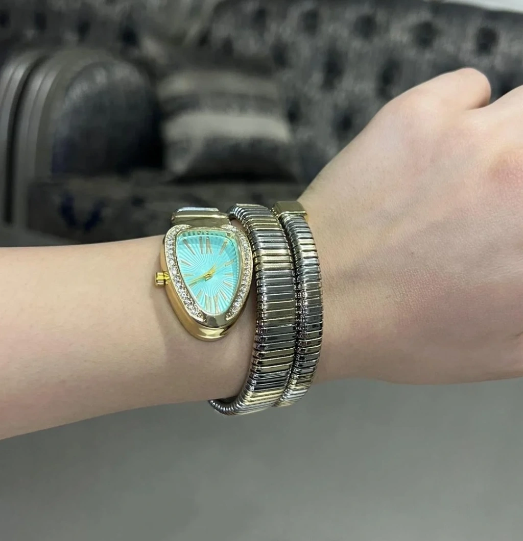 Altın Renk Taş Kaplama Beyaz Kadran Yılan Saat Dolamalı Saat