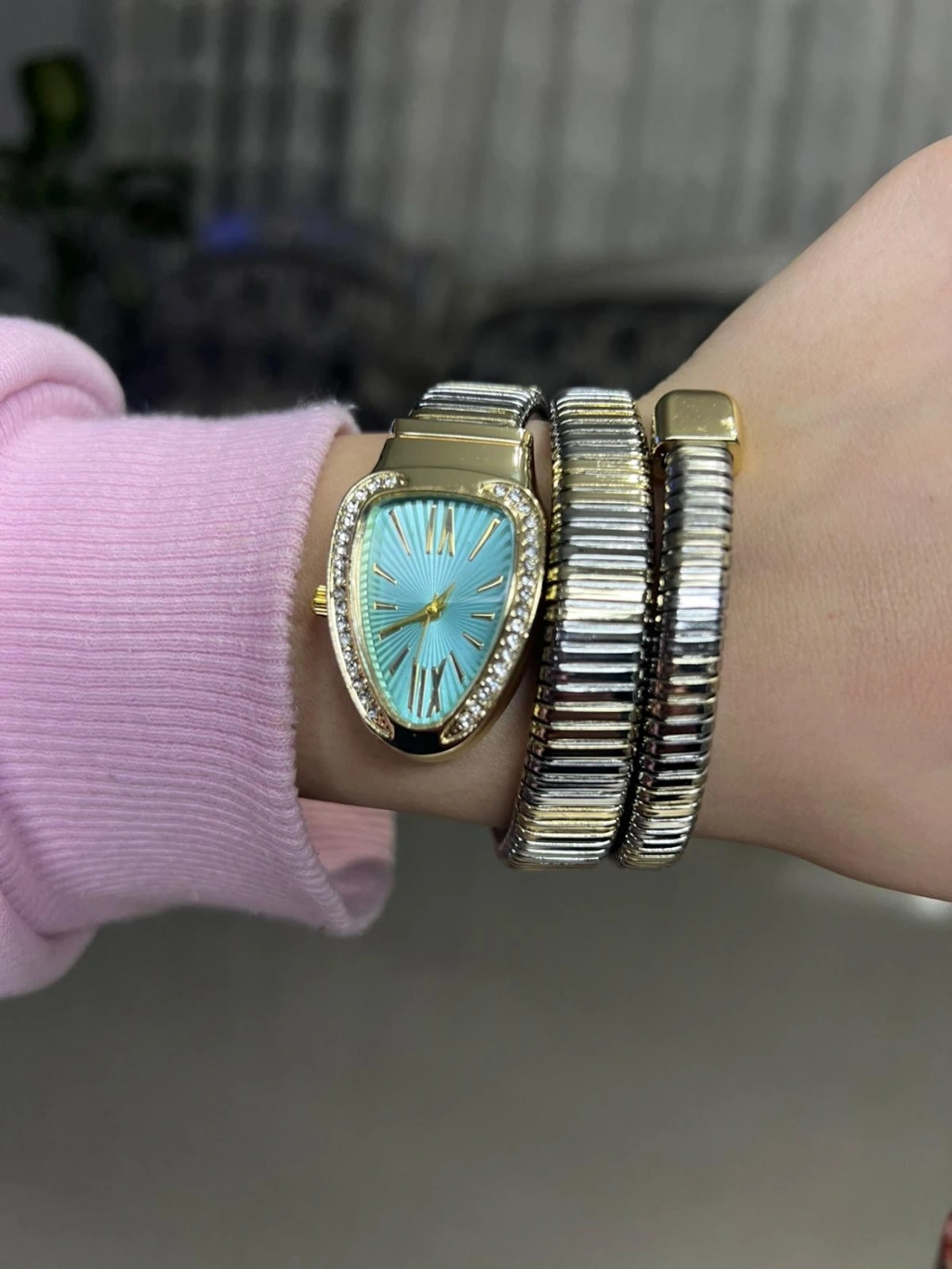 Kadın Altın & Gümüş Renk Detaylı Turkuaz Kadran Taşlı Bilezik Saat